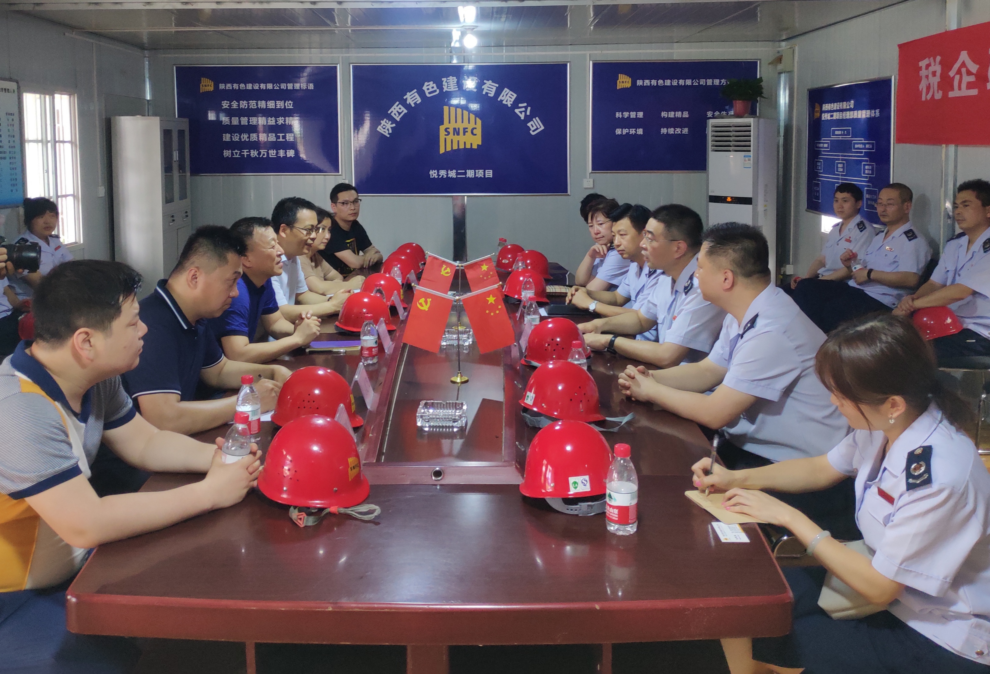 近日,西安市稅務局第二稽查局和我公司在西安鵬潤悅秀城二期2.1標段項目部聯合舉行以“稅企聯動、掃黑除惡”為主題的宣傳活動,西安市稅務局第二稽查局副局長宋曉軍、公司總經理楊明鈺、總會計師陳毓等兩家單位有關領導及項目施工管理人員參加了本次活動。