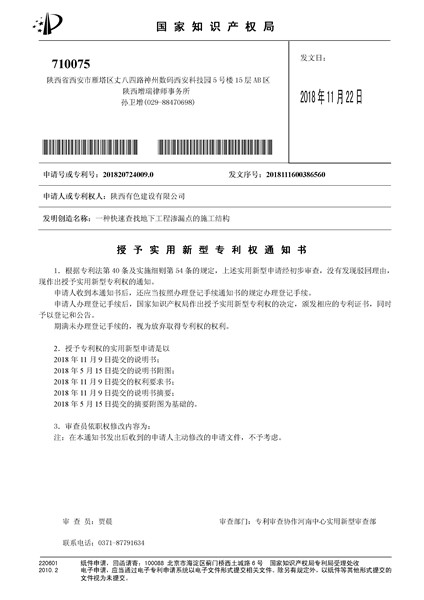 近日,由有色陜建申請的實用新型專利“一種快速查找地下工程滲漏點的施工結構”被國家知識產權局授權,專利號:201820724009.0。